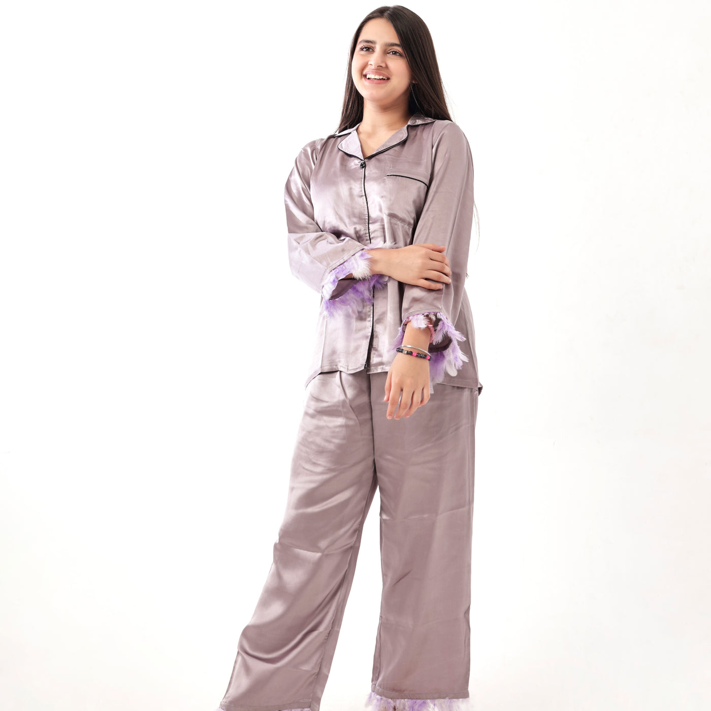 Finished with matching lilac feathers on the sleeves and pant bottoms, it adds a touch of dreamy elegance — delicate, playful, and picture-perfect for those birthday selfies and midnight cake moments.