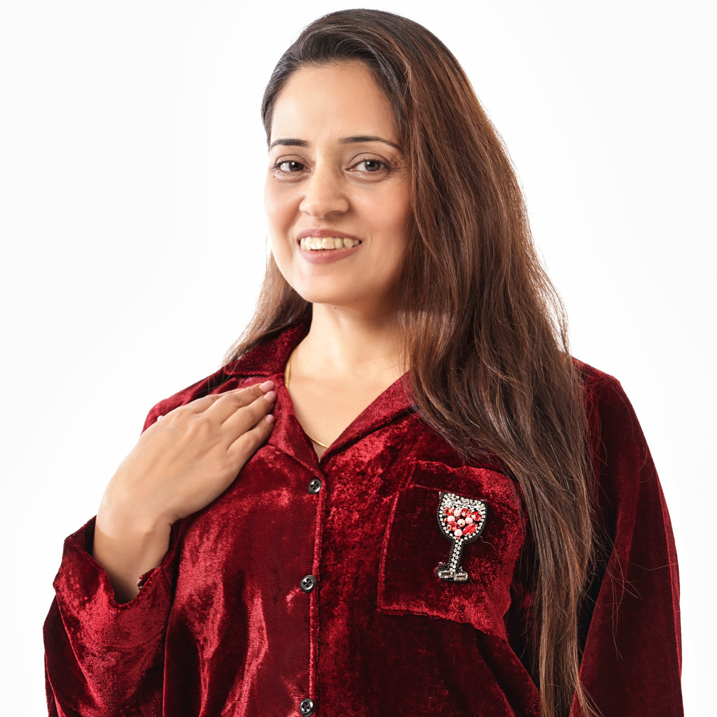 Bringing a touch of indulgence, the set features a handcrafted wine-glass patch on the pocket, delicately embroidered to capture the spirit of relaxed evenings and quiet celebration. Designed with fully packed buttons, it ensures a seamless, polished look — no gaps, just grace. ✨