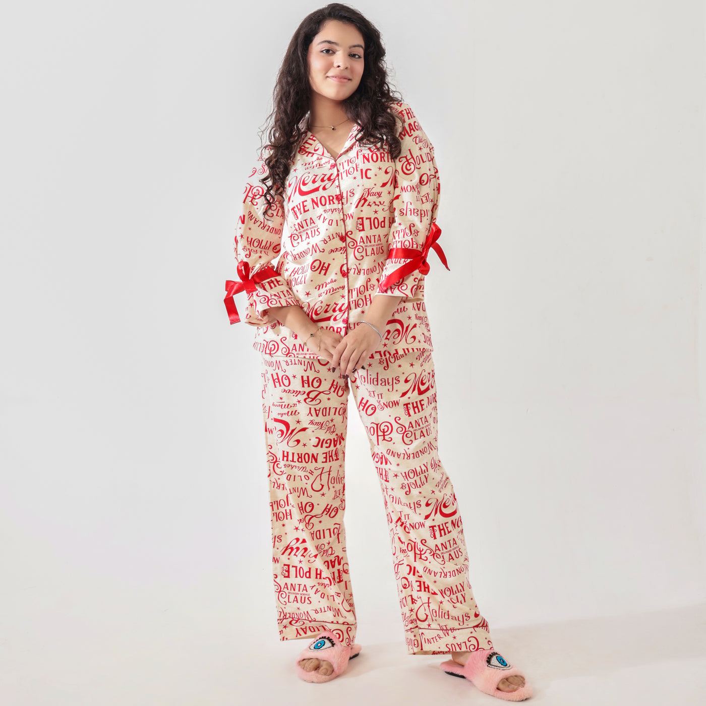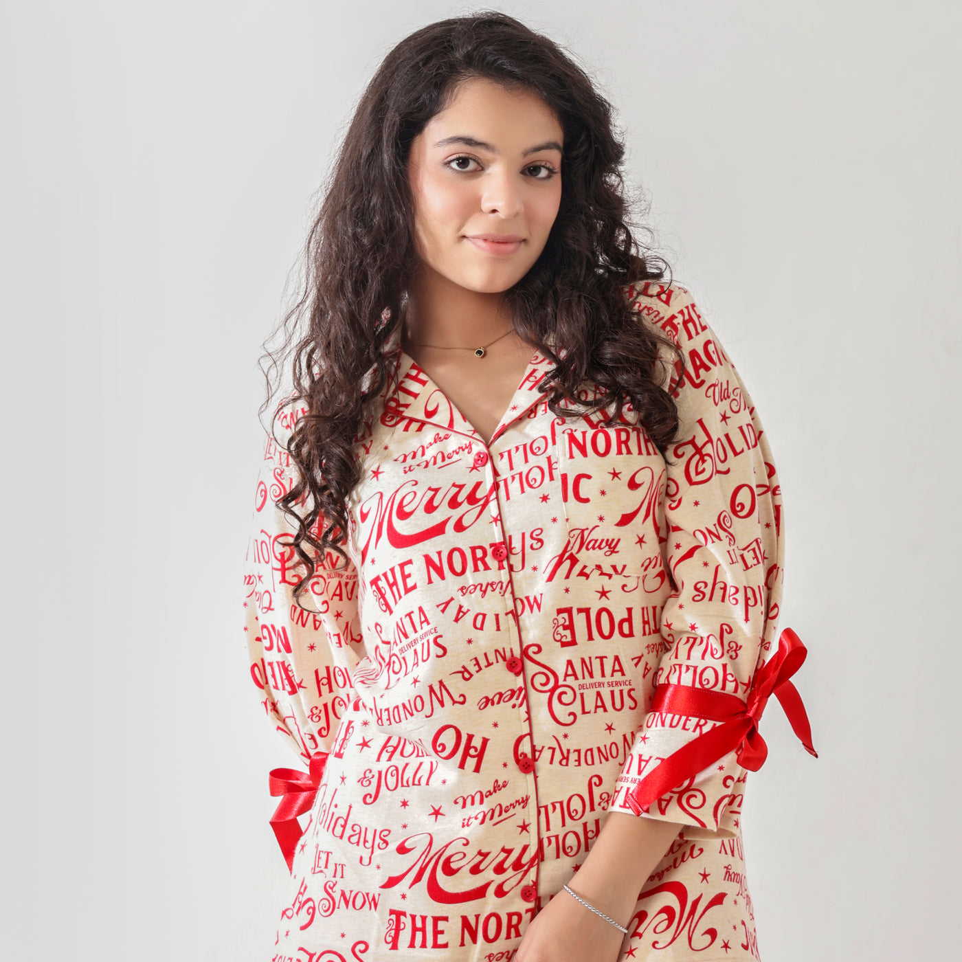 Set on a cream base , it’s a playful nod to the happiest season of the year. Designed in a relaxed fit that moves with you and finished with red ribbons on the sleeves that can be tied into pretty bows, it’s festive, feminine, and oh-so-comfy.