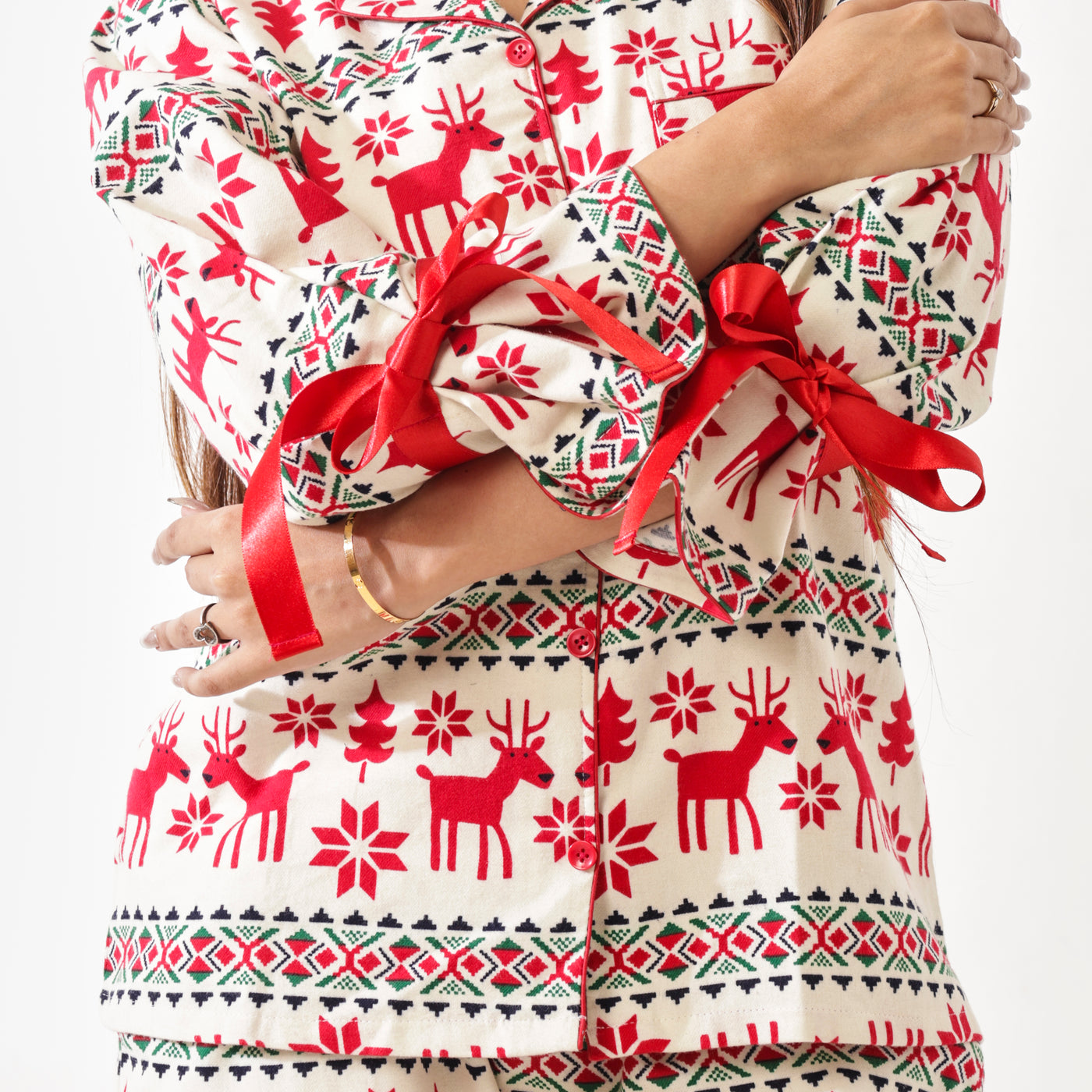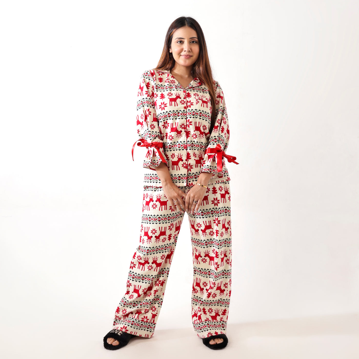 Adorned with adorable red reindeers on a soothing cream base, it blends comfort with charm. The red ribbons on the sleeves tie into pretty bows, adding a playful touch, while the fully packed buttons ensure a neat, gap-free finish — no fuss, just flawless comfort.