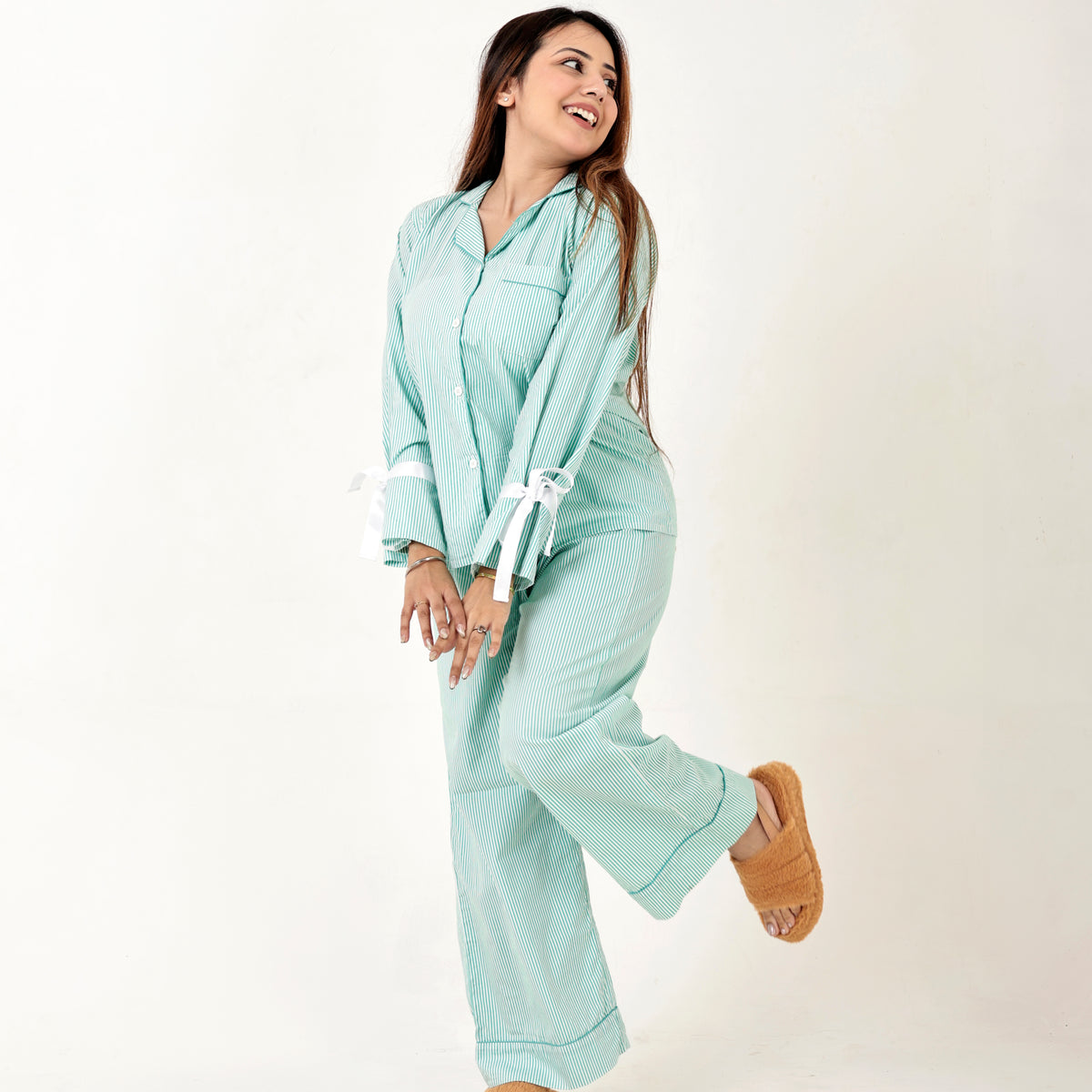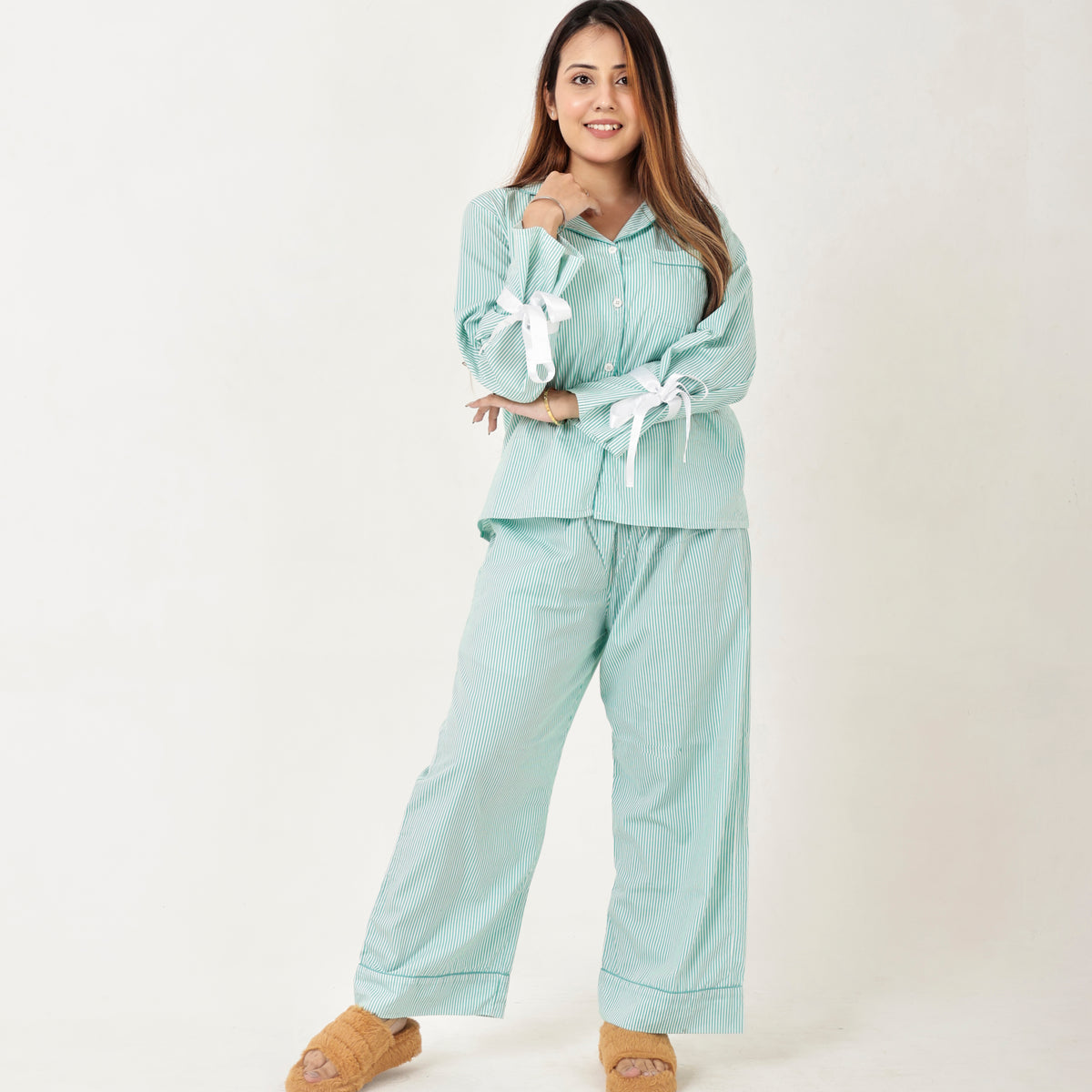 Designed in a relaxed fit that moves as freely as you do, it features fully packed buttons to keep everything neat (no gaps, no fuss!) and cute ribbons on the sleeves that can be tied to your comfort — adding just the right touch of playful charm.